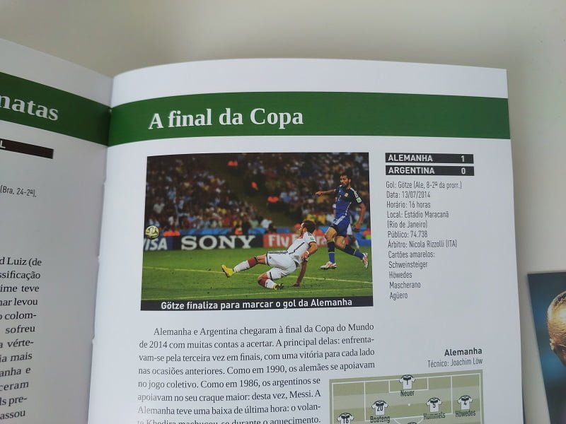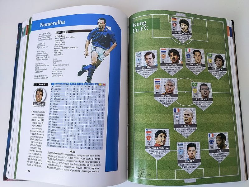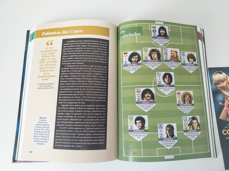 Outra coisa que me chamou atenção também é que o livro aborda as polêmicas de cada copa, como por exemplo, da França em 1998. Também não deixa de citar a goleada da Alemanha no Brasil em 2014, a importância de Lionel Messi, Zidane, Maradona, entre outros estrangeiros, além é claro dos brasileiros. Alguns trechos que apareceram bem nostálgicos como Pentacampeonato em 2002 com a seleção de Felipão. O livro é bastante ilustrado com 304 páginas de uma edição impecável. capa dura, papel de alta qualidade e ótimas imagens em cada capítulo.